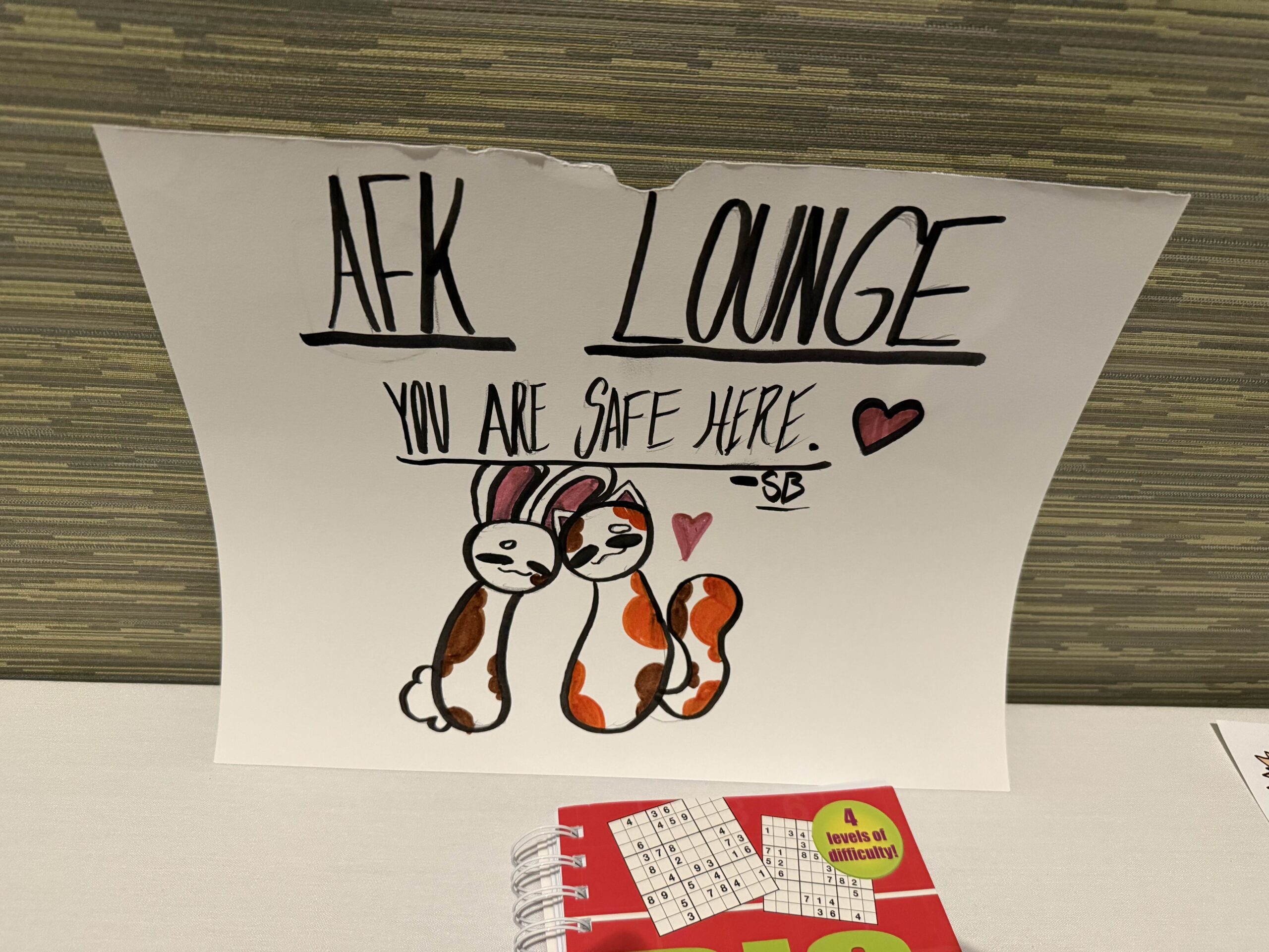 The Take This AFK Quiet Room is a low-sensory quiet space where attendees can rest, recharge, and reclaim their calm. When you enter the AFK Quiet Room, you’ll be greeted by gentle lighting, an array of coloring and activity books for you to peruse, and lots of space to sit and relax. The room is staffed by Take This volunteers who ensure the space remains a cozy oasis. Whether you’re feeling overwhelmed by the chaos of the convention or just want a place to get off your feet, the Take This AFK Quiet Room is there for you.